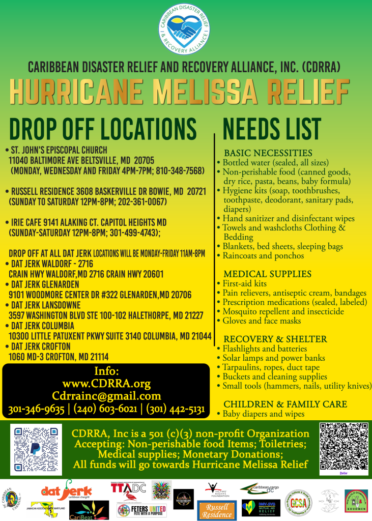 The Caribbean Disaster Relief and Recovery Alliance (CDRRA) developed as the byproduct of an overwhelming outpouring of support and a call to action to respond to the widespread destruction caused by Hurricane Irma in the Caribbean. An emergency meeting was held on 8 September in Bowie, MD and was attended by persons representing the Caribbean Diaspora in the DC, Maryland and Virginia (DMV) area.